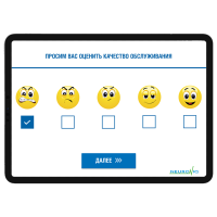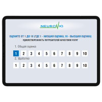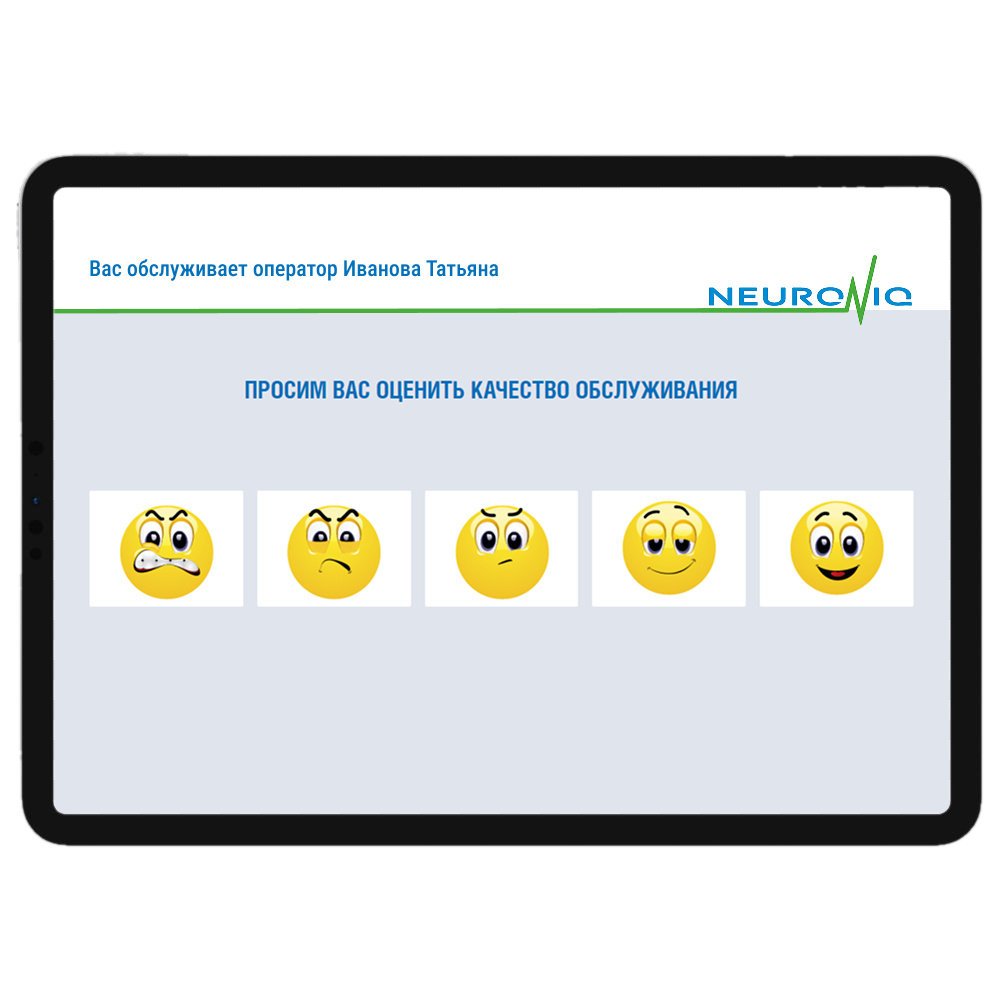 Интерфейс системы оценки качества Neuroniq для планшетов позволяет выставлять оценки по параметрам обслуживания ( скорость, степень решения вопроса и другие), а также проводить анкетирование покупателей с целью получения более подробной информации.
