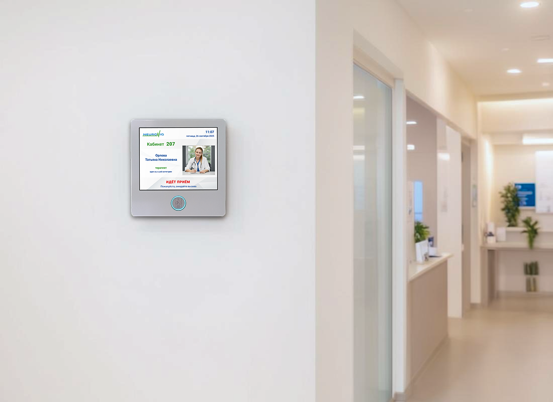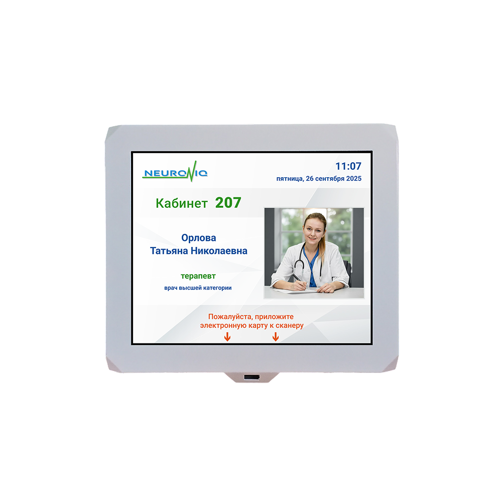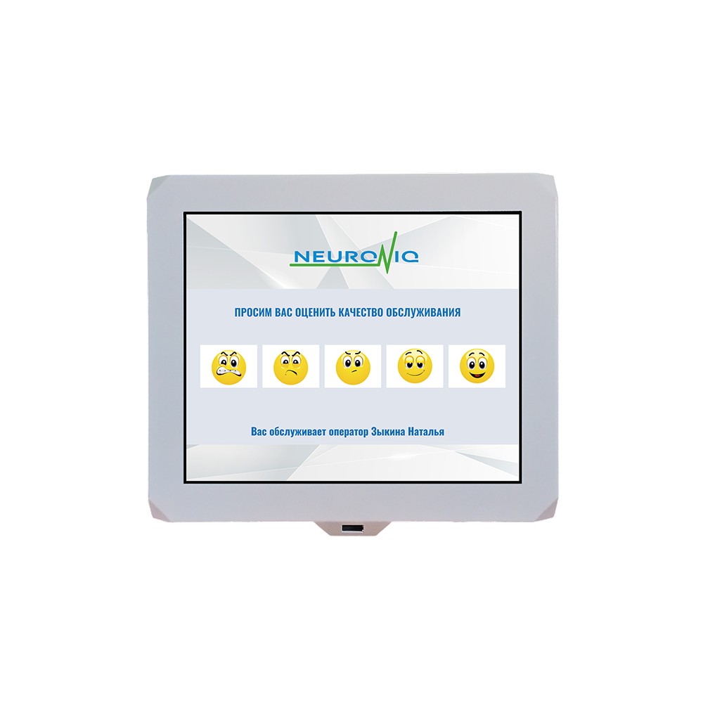 Информационные аппараты Neuroniq могут быть персонализированы с фирменным стилем заказчика – возможна покраска корпуса в фирменный цвет (палитра цветов RAL), нанесение логотипа заказчика, надписей, индивидуальное оформление выводимой на экран информации.